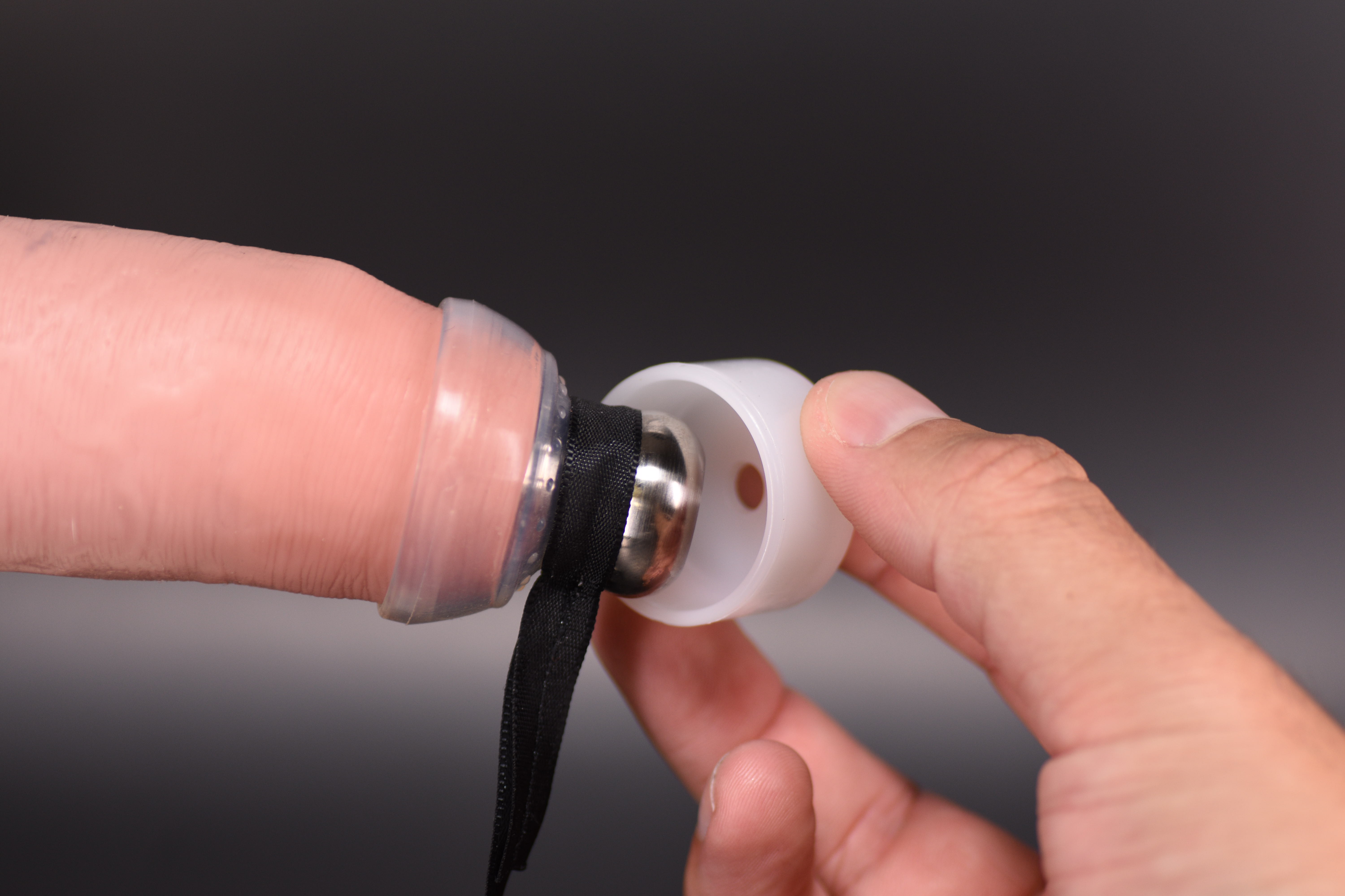 Position The P-tainer with the V-shaped notch facing toward the ground. Carefully align the V shape with your frenulum and gently place it against your glans.